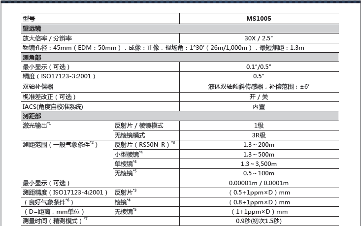 符合《測(cè)繪資質(zhì)分級(jí)標(biāo)準(zhǔn)規(guī)定(2014版)》中“大地測(cè)量”及“工程測(cè)量”甲級(jí)認(rèn)證標(biāo)準(zhǔn)對(duì)高精度全站儀的要求。